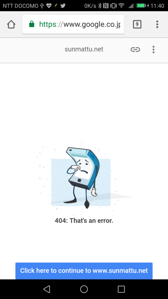 温かい目で、「Click here to continue to (ドメイン名)」の青ボタンをタップしてあげてください。