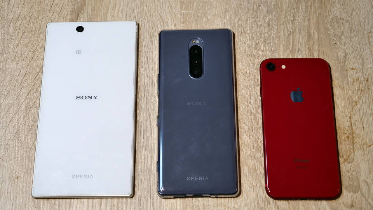 真ん中がXperia 1。右がiPhone 8,左がXperia Z Ultraです。