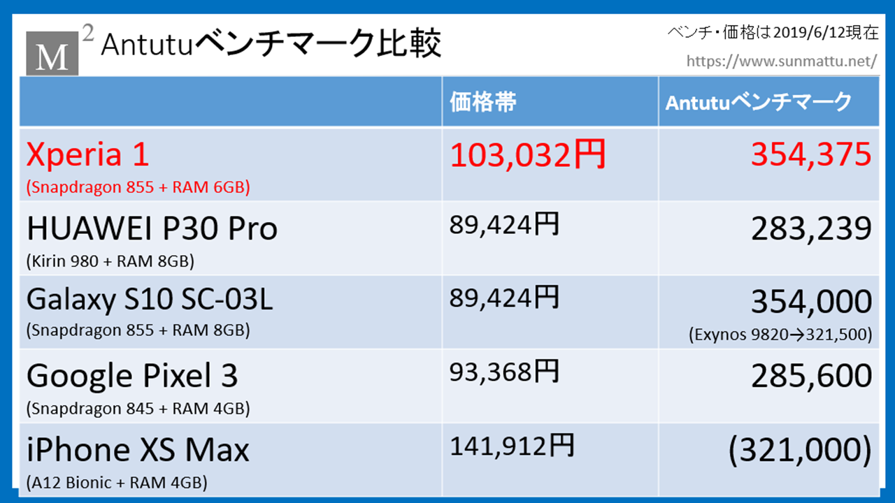 Xperia 1はGalaxy S10やHUAWEI P30 Proなど対抗機に比べ、15,000円程度高いですが、Antutuベンチマークも同等またはそれ以上の力を発揮していますね。