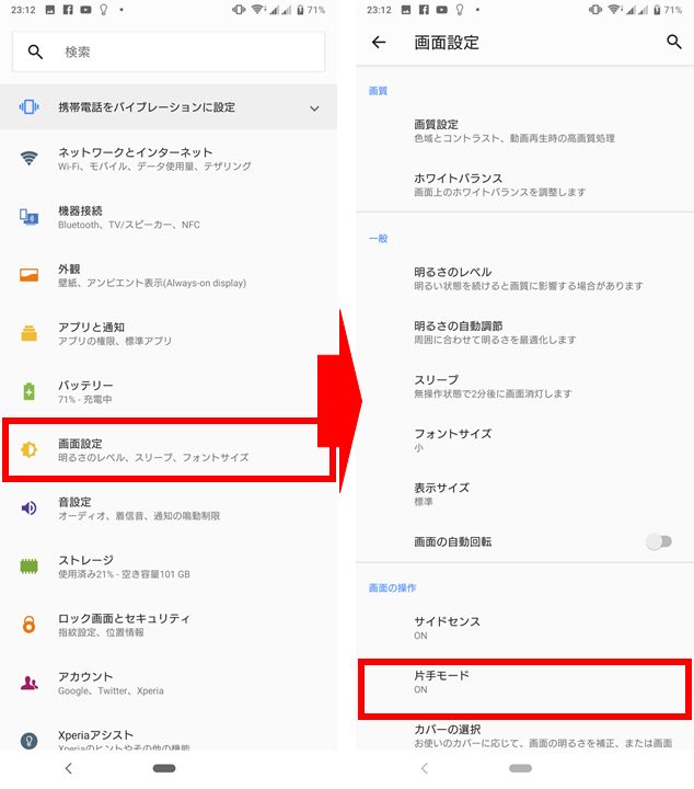 設定>画面設定>片手モード、にON/OFFのスイッチがあります。