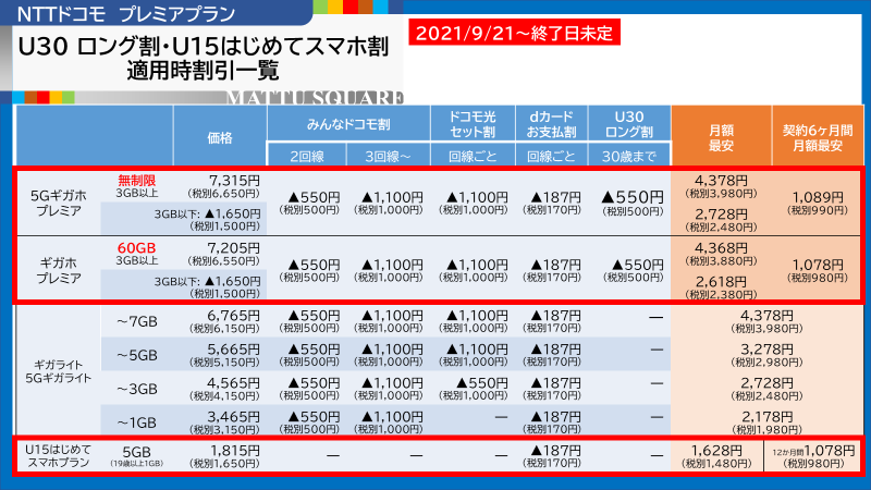 NTTドコモは、無制限の「5Gギガホ プレミア」などを対象に、30歳の誕生日まで550円の割引が続く「U30 ロング割」を提供しています。