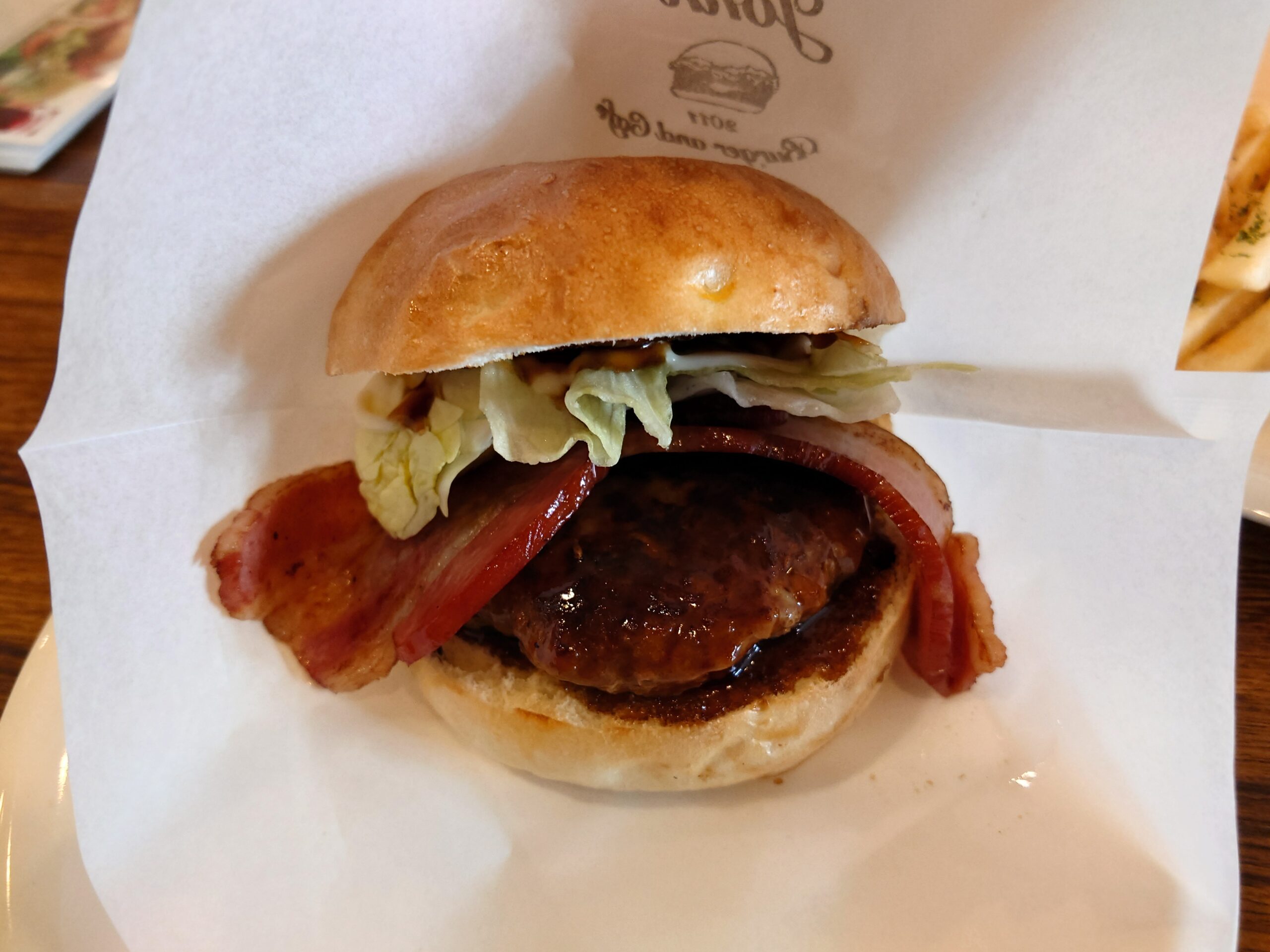 すこしザラっと感は出ていますが、ハンバーガー以外の被写体もピンとあって映っております。