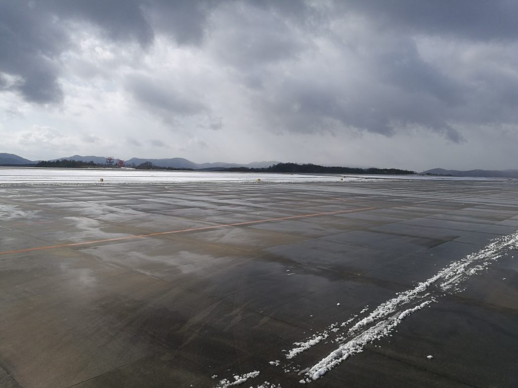 搭乗時は、かなり雪の降った翌日だったため、滑走路のお隣の芝生は、雪で覆われていました。
